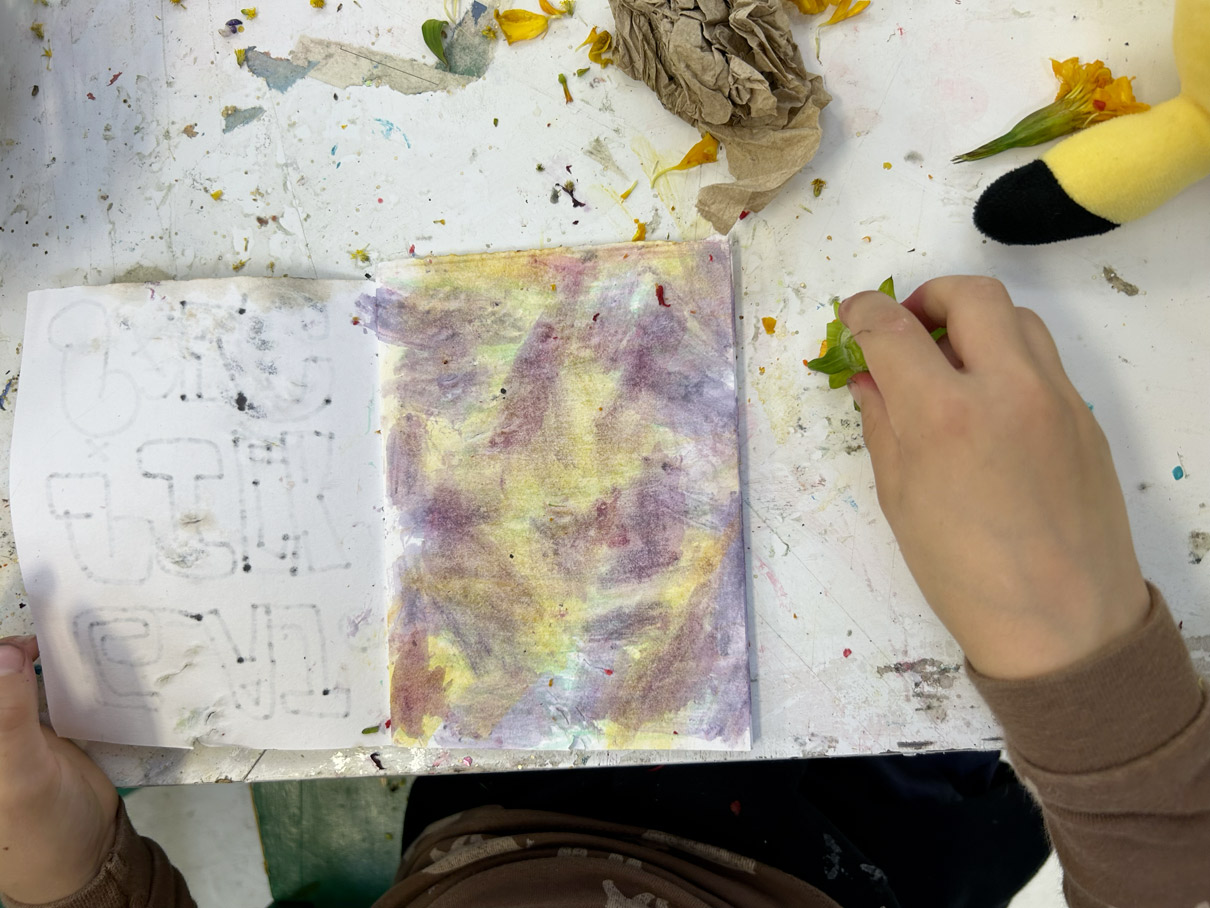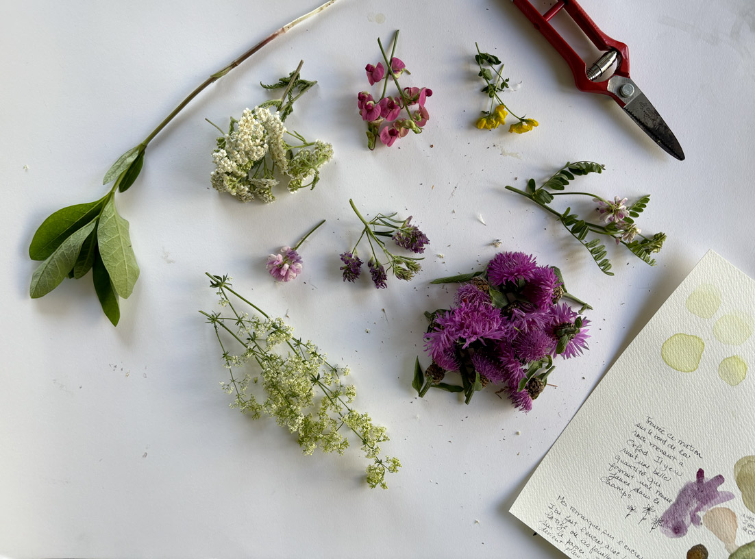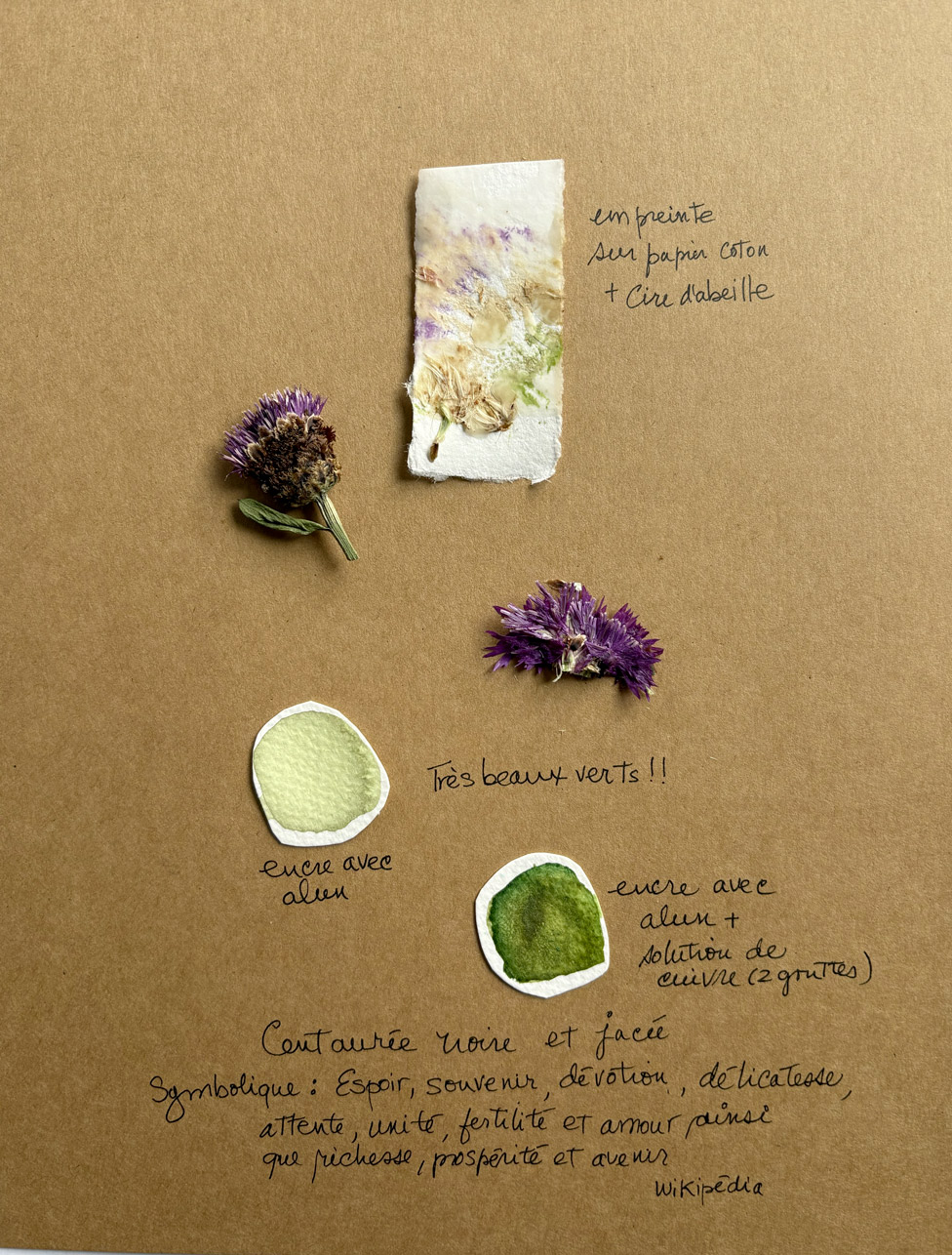 Je propose également à des publics variés des ateliers de fabrication et de création d’encres végétales, réalisés à partir de matières végétales mises au rebut ou peu valorisées, telles que les pelures issues du compost et les plantes spontanées locales (fleurs et « mauvaises herbes »).