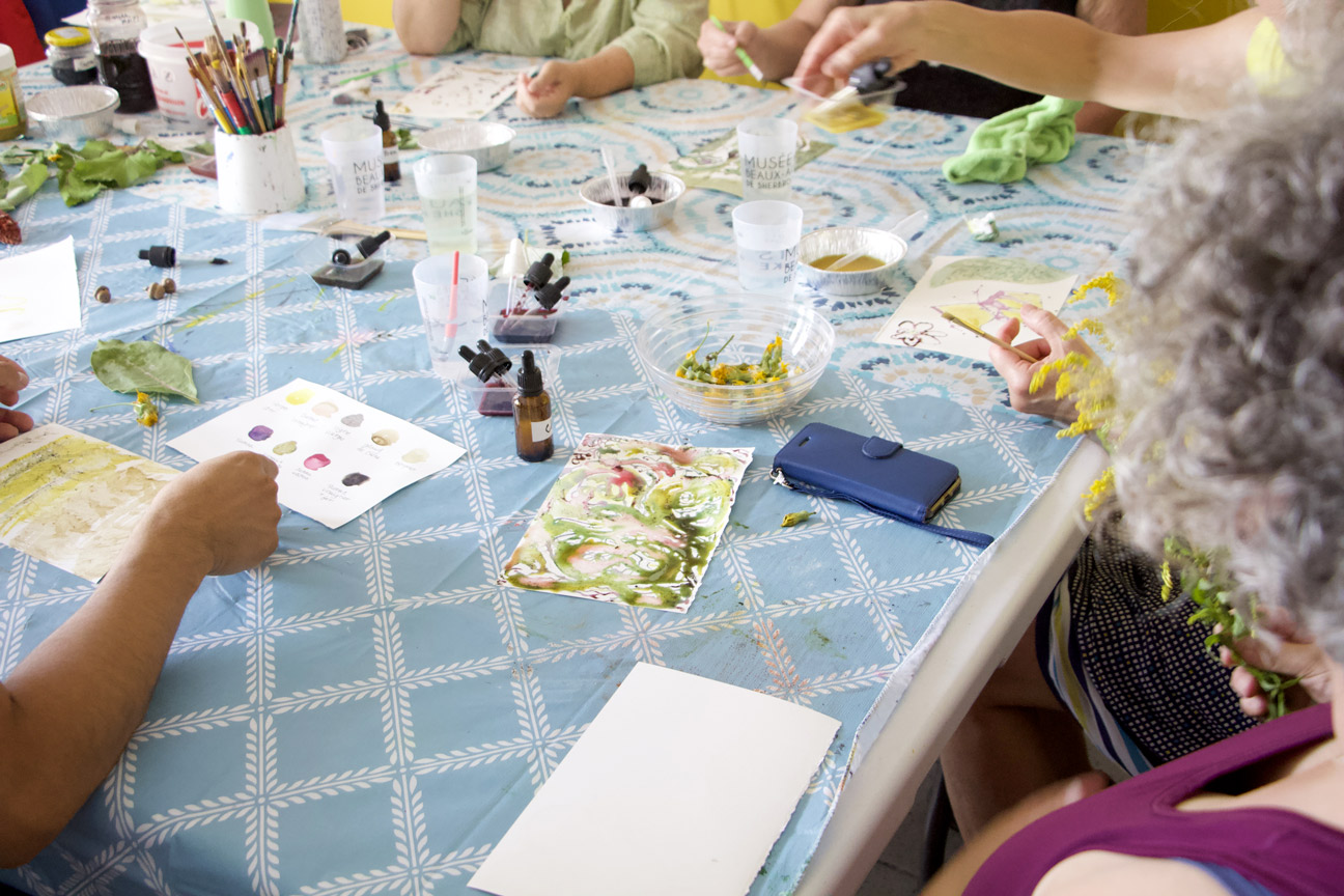 Ateliers de fabrication et de création d’encres végétales à partir de végétaux rejetés ou mal aimés : pelures du compost, mauvaises herbes (fleurs et plantes sauvages locales).